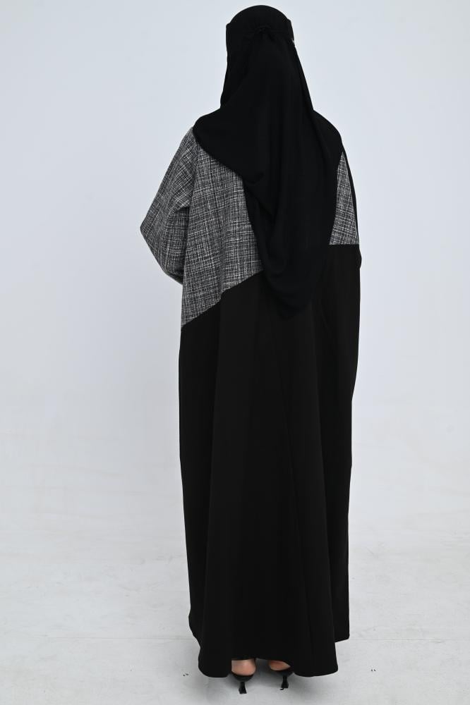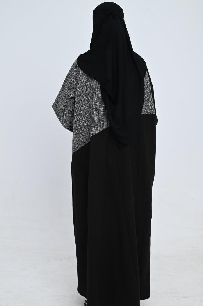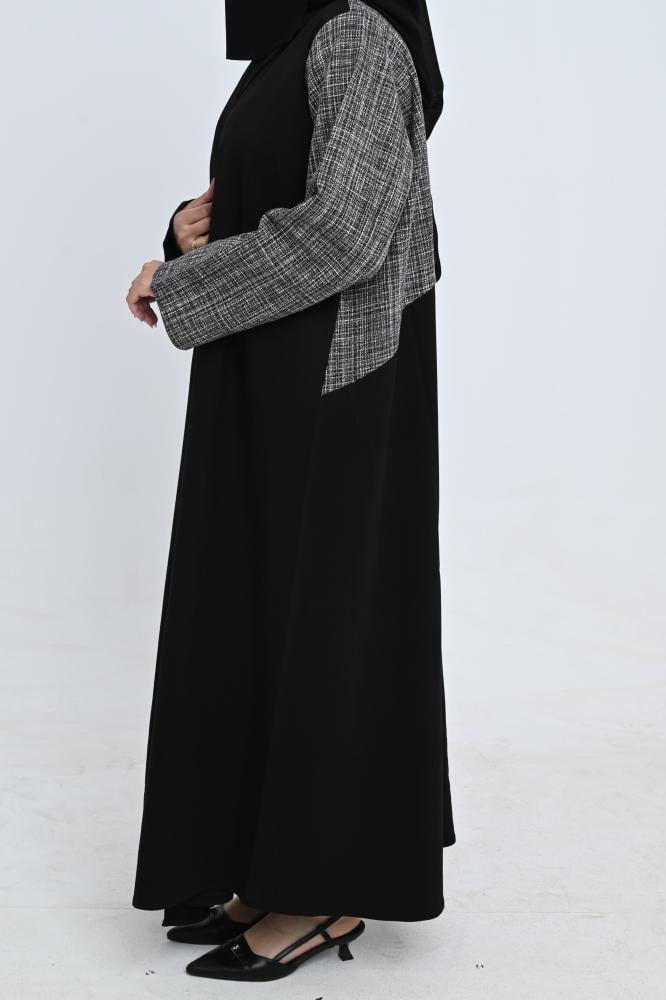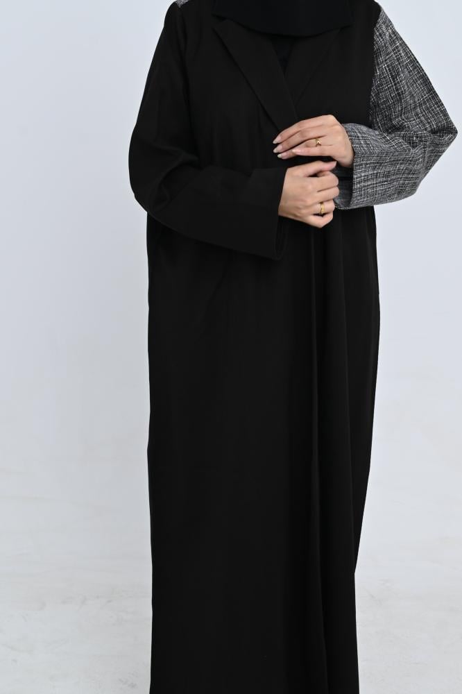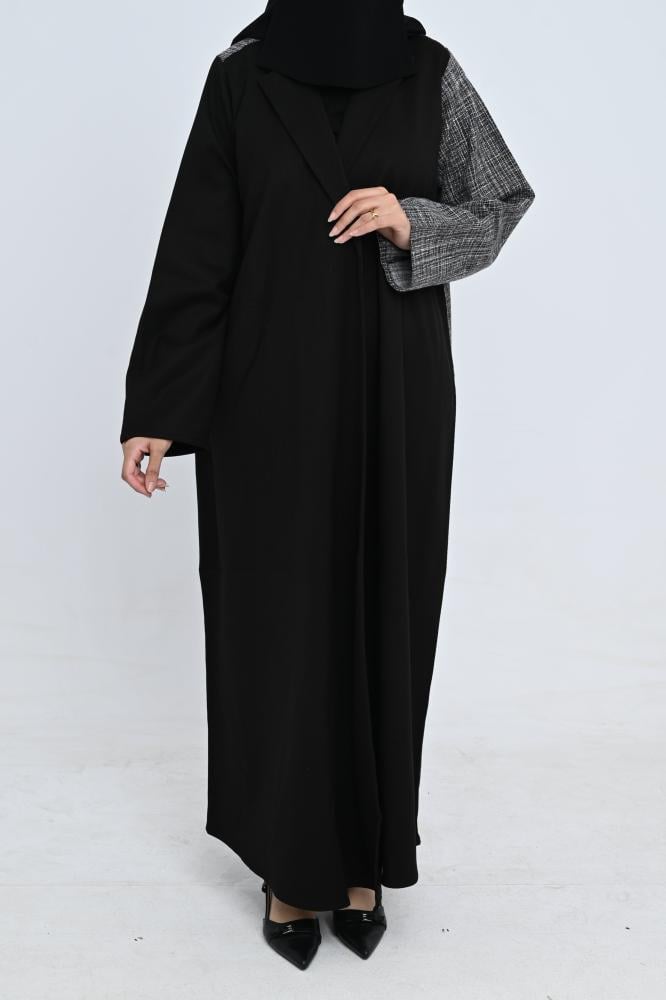 مصنوعة من قماش ثقيل فاخر باللون الأسود يمنحك دفء مريح وأناقة راقية تناسب أجواء الشتاء، مع تفاصيل رمادية أنيقة على الأكمام تضيف لمسة فخمة وعصرية.