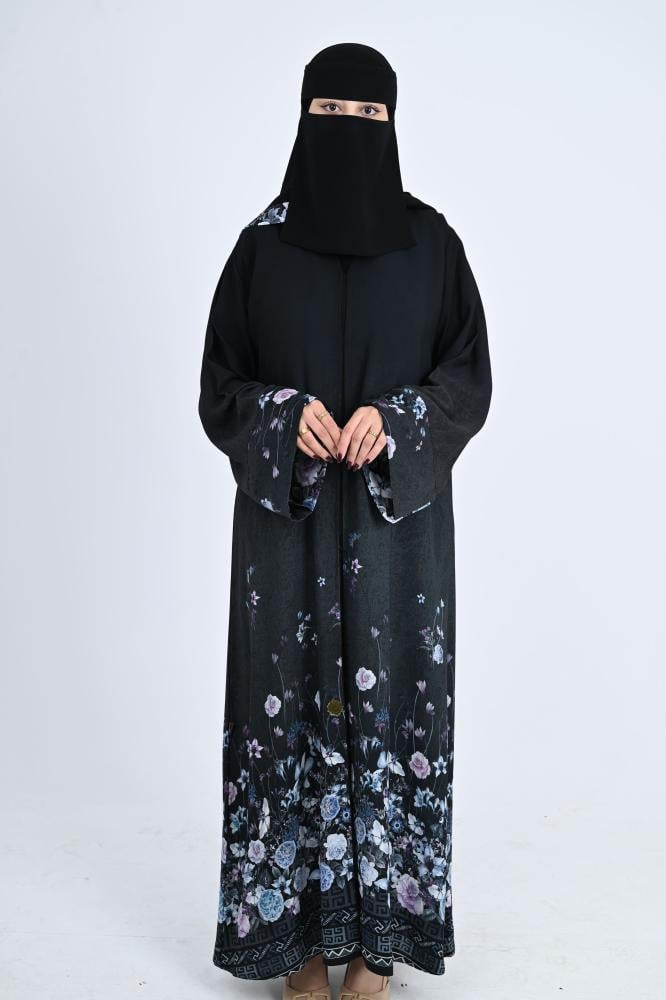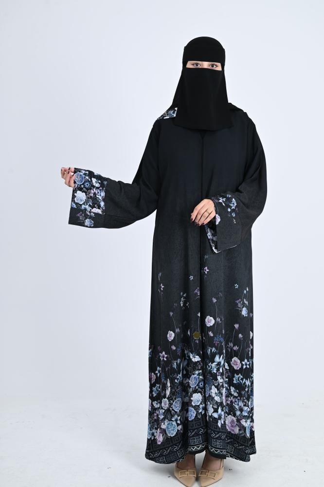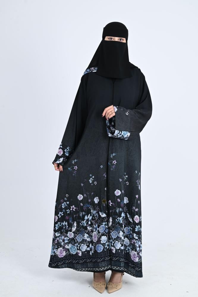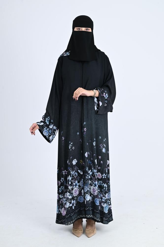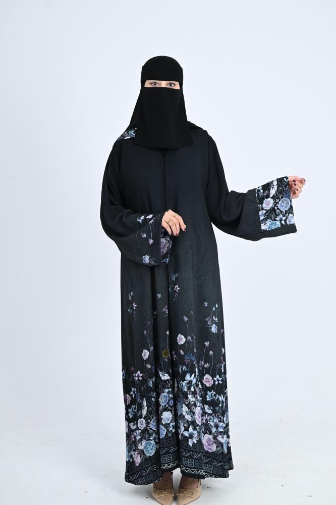الألوان: أسود أنيق مزين بطبعات أزهار ناعمة بألوان البنفسجي، الموف، الأزرق الفاتح، الأبيض، والرمادي لمظهر متكامل وراقي.