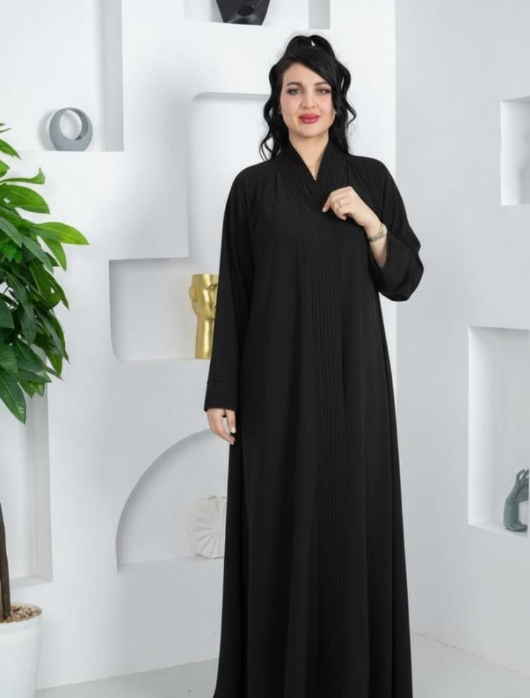 تصميمها كلوش واسع يمنحك حضور أنيق وانسيابية جذابة في الحركة، مزينة بـ كسرات أمامية وكم بكسرات مرتبة تضيف لمسة أنوثة ناعمة ومميزة.