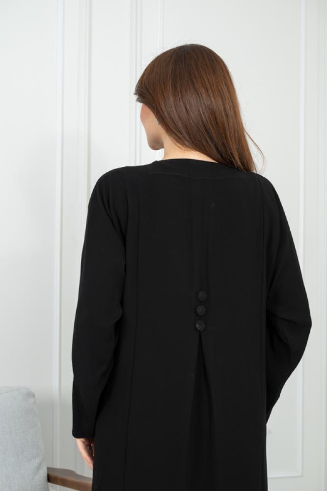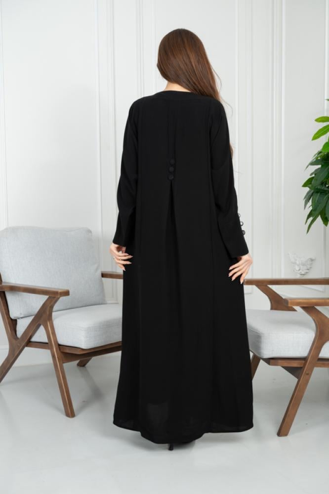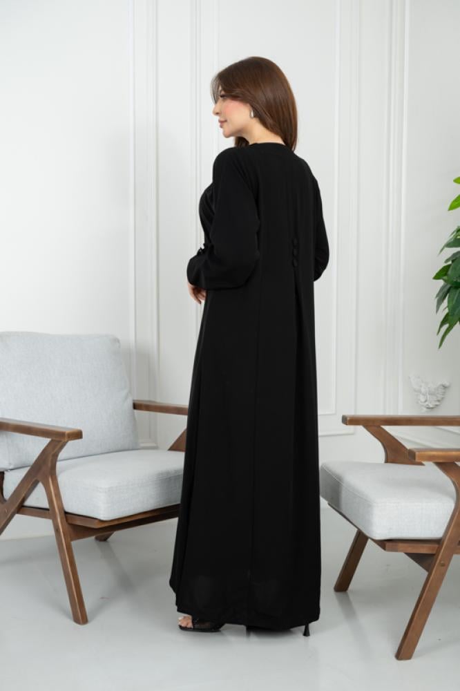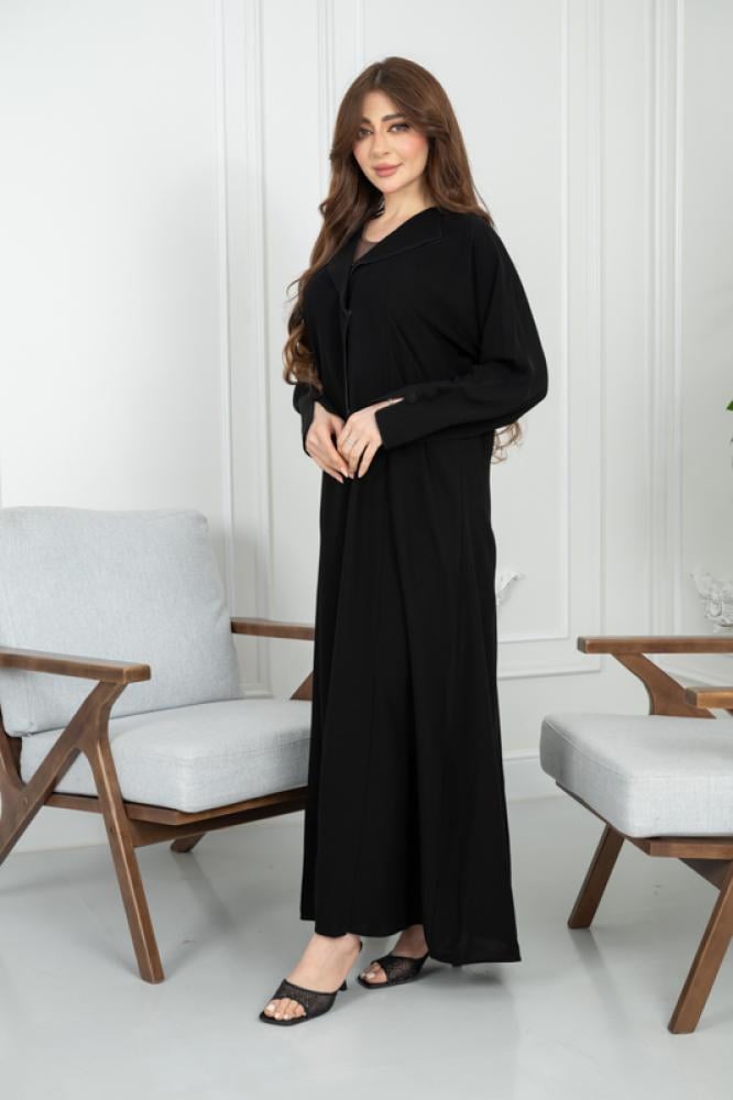 - القماش: قماش ثقيل يمنح العباية مظهراً فاخراً وثباتاً في القوام.